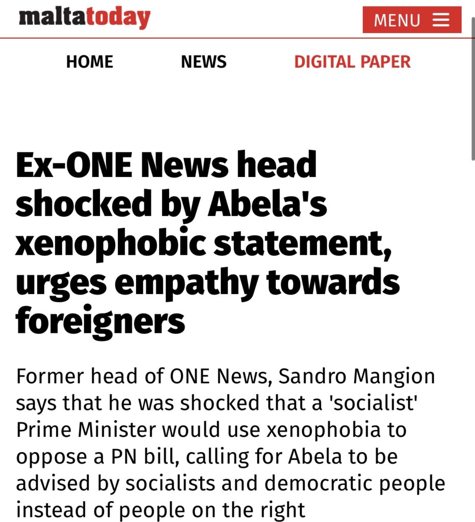 Sandro Mangion said he was stunned that a self-described socialist prime minister would resort to xenophobic rhetoric to block a PN bill, urging Abela to seek counsel from socialists and democrats rather than right-wing figures.