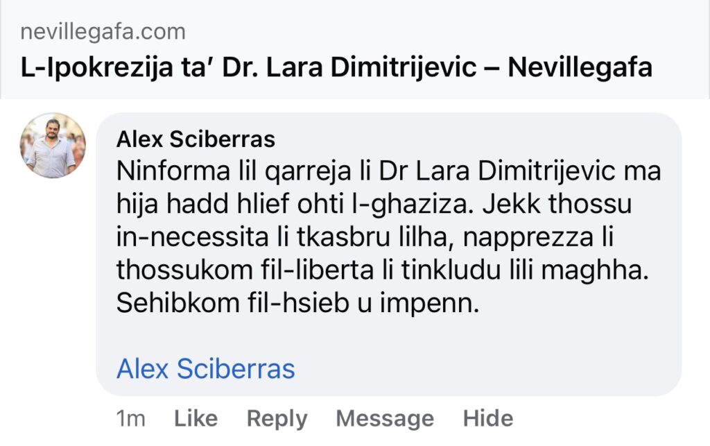 “Ninforma lil qarreja li Dr Lara Dimitrijevic ma hija hadd hlief ohti l-ghaziza. Jekk thossu in-necessita li tkasbru lilha, napprezza li thossukom fil-liberta li tinkludu lili maghha. Sehibkom fil-hsieb u impenn. Alex Sciberras.”