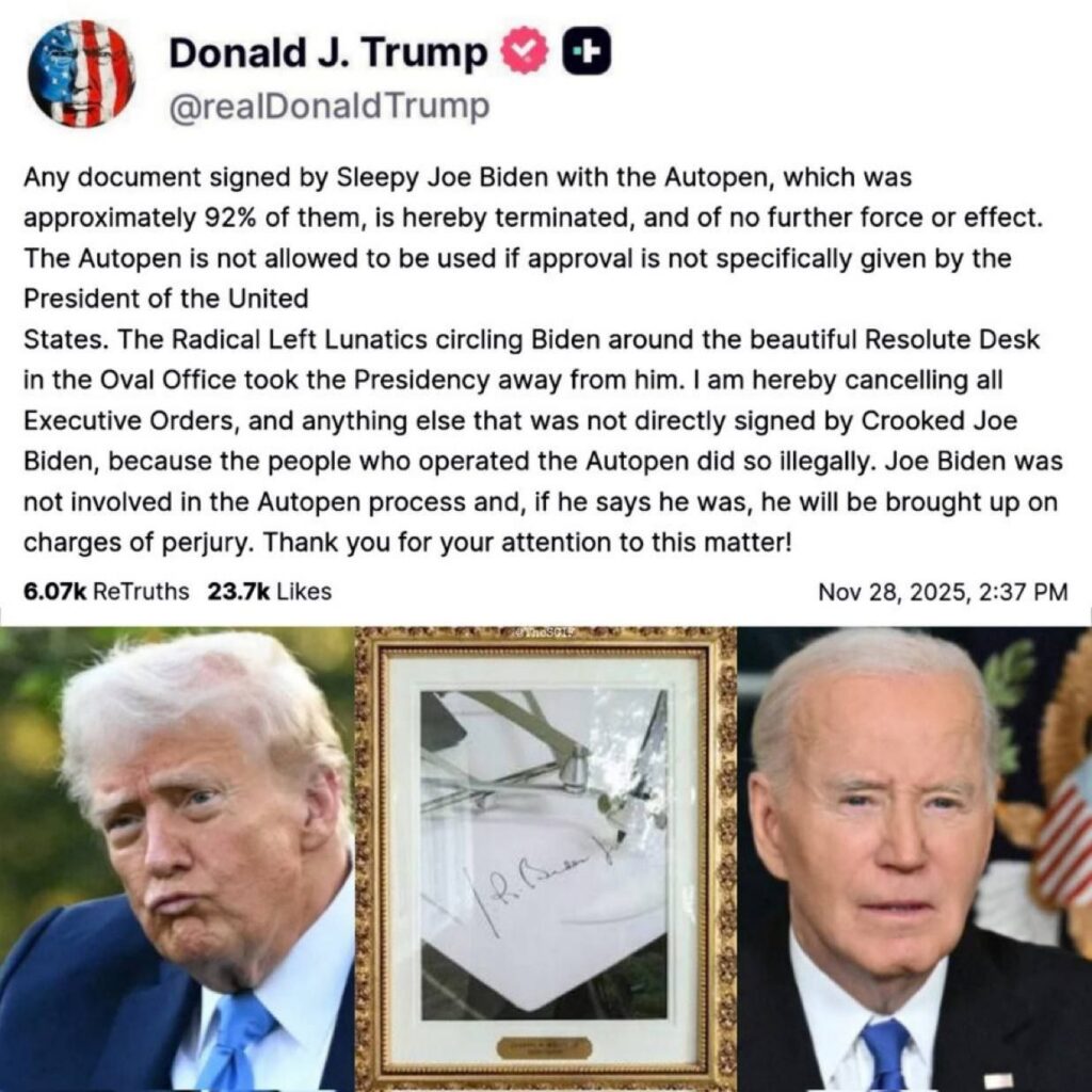 Trump declared that every Executive Order signed by Autopen, almost all of Biden’s directives, is illegal and void.