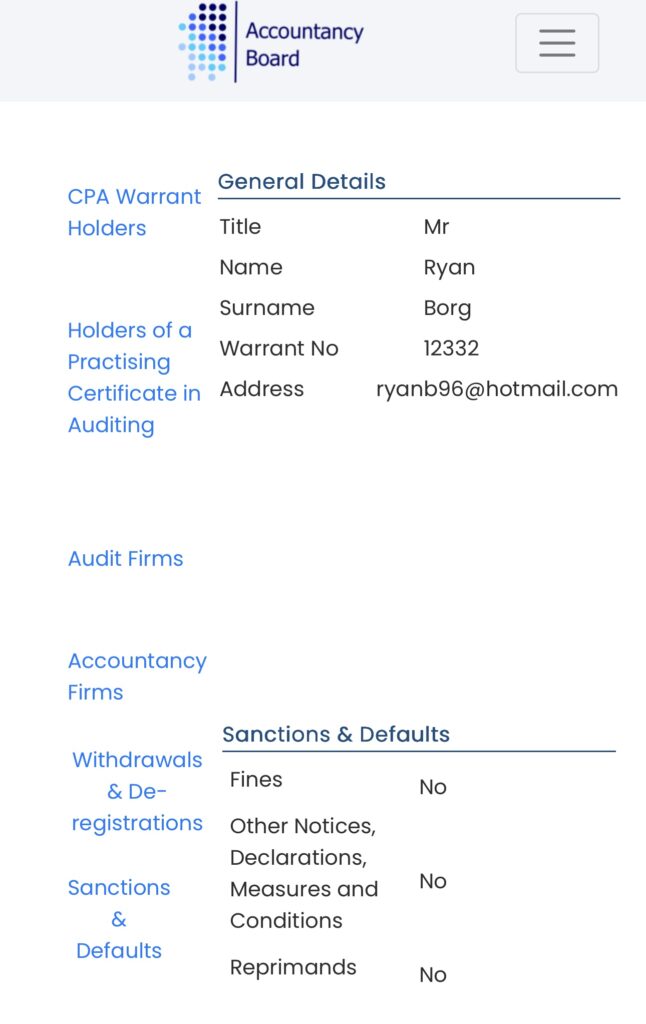 Ryan Borg għandu warrant number 12332 biex jista’ jagħmel audits. Il-liġi tesiġi li kumpaniji ta’ accounting jew auditing ikunu rreġistrati mal-Accountancy Board.