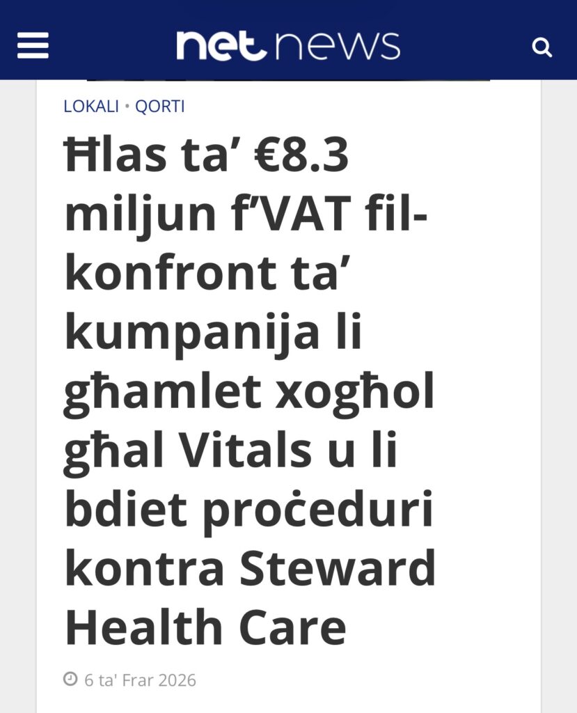 Nirreferi għal rapport ta’ Net News intitolat “Ħlas ta’ €8.3 miljun f’VAT fil-konfront ta’ kumpanija li għamlet xogħol għal Vitals u li bdiet proċeduri kontra Steward Health Care.”