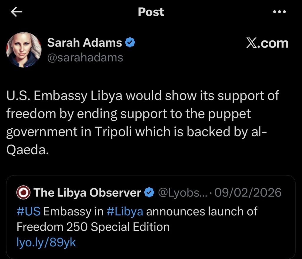 Adams claims that individuals linked to al-Qaeda, including some involved in the Benghazi incident, hold influential positions within Dbeibah’s administration in Tripoli. For instance, she has described the Tripoli government as a “puppet” backed by al-Qaeda and accused it of enabling terrorist activities, such as being aware of al-Qaeda plots against rival forces in eastern Libya led by General Khalifa Haftar’s Libyan National Army (LNA).