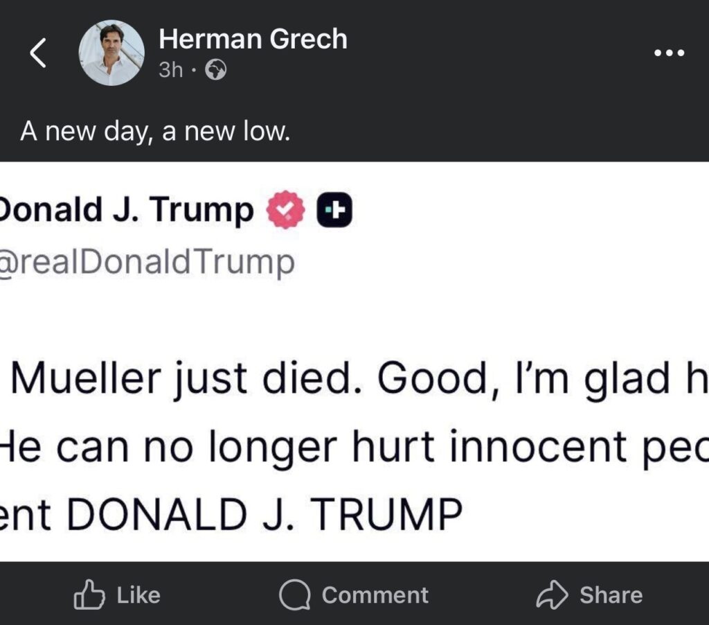 Herman Grech, li l-eroj tiegħu hija Daphne Caruana Galizia, tgħidx kemm tkaża b’ dak li qal Donald Trump meta sar jaf bil-mewt tal-korrott Robert Mueller.