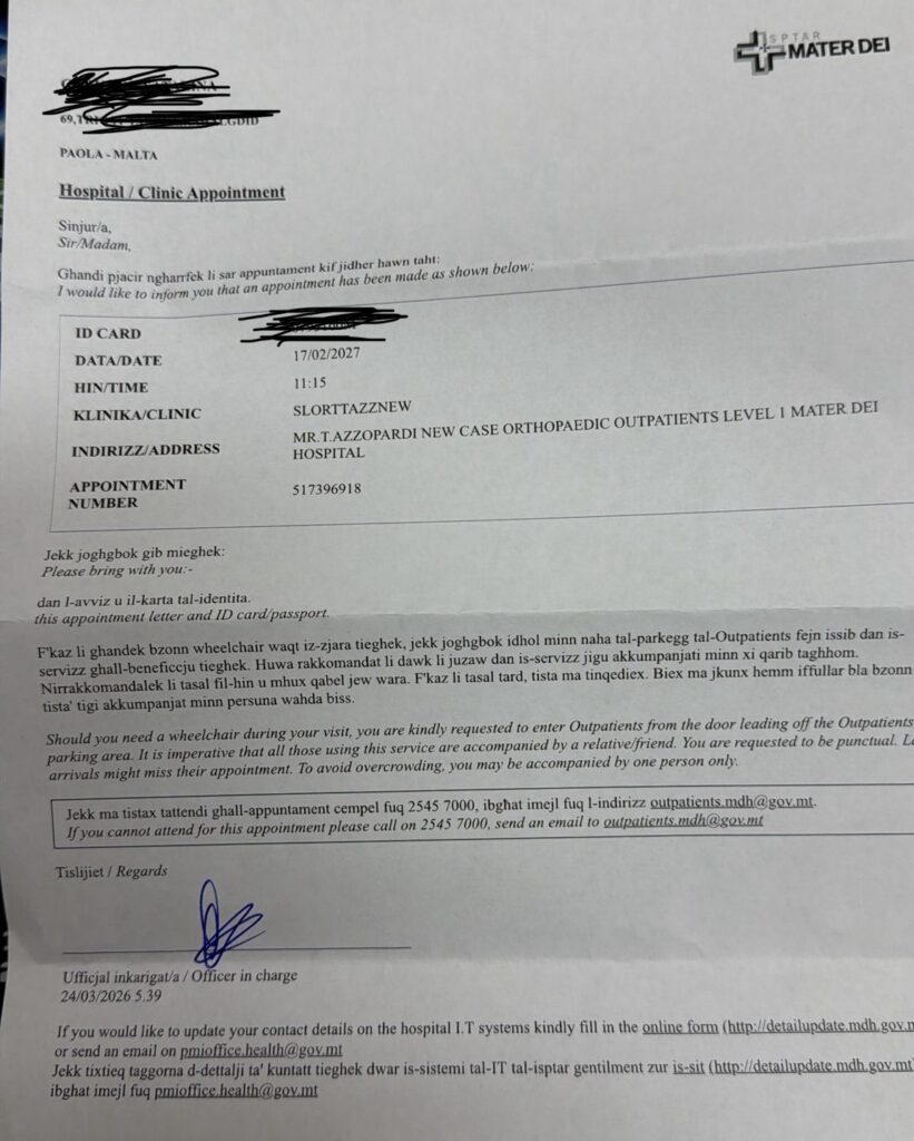 Fl-istess waqt li l-Ministru għas-Saħħa mar jippoppa sidru quddiem il-cameras, mijiet ta’ ċittadini Maltin qegħdin jirċievu appuntamenti mill-isptar Mater Dei saħansitra datati Frar 2027. Fost dawn hemm anzjani li bil-kemm jifilħu jagħmlu pass, aħseb u ara kemm jistennew sena biex imisshom vista quddiem xi konsulent.