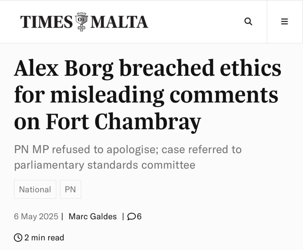 The clearest embodiment of Epictetus’s paradox came in the Fort Chambray controversy. Borg had strongly backed a controversial development concession on Gozo. When challenged on social media over misleading claims about costs and restoration obligations, the Standards Commissioner investigated and ruled that Borg had breached ethical standards by making inaccurate public statements. The Commissioner ordered a written apology. Borg refused. The matter was referred to the parliamentary standards committee, which ultimately took no further action, but the refusal itself was telling.