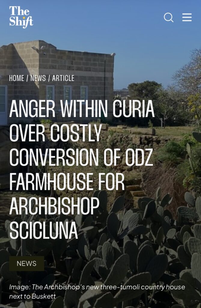 F’artiklu ppubblikat minn The Shift ġie kkwotat li bosta membri tal-kleru li jiffurmaw parti mill-Amministrazzjoni tal-Kurja esprimew rabja dwar dak li ddeskrivew bħala nfiq eċċessiv mill-fondi tal-Knisja biex jiġi konvertit razzett antik li jinsab barra ż-Żona tal-Iżvilupp (ODZ) fil-Buskett, f’residenza lussuża għall-Eċċellenza Tiegħu l-Arċisqof Charles Ġuda Scicluna.